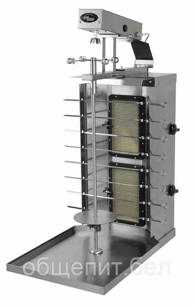 2 горелки с ситемой газ-контроль, производительность до 60 кг/мяса, 8 шампуров для шашлыка, газ-контроль, усиленный электропривод основного шампура с сохранением возможности ручного вращения, поддон для мяса, полностью из нержавеющей стали